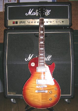 LesPaulStandard 2002 2002年の普通のスタンダードです。 Ornettsのレスポールを売って手に入れたGibsonですが・・・Ornettsの方が音がいいぞ!(>_<)/。。うぐ・・・ 楽器をブランドだけで判断してはいけませんな・・・。 赤が残ってる虎目が好きなので色は満足♪ ボディ:メイプルトップ・マホガニーバック ネック:マホガニー ペグ:グローバー・・・に換える予定 ピックアップ:F&R:Gibson Burstbucker Pro